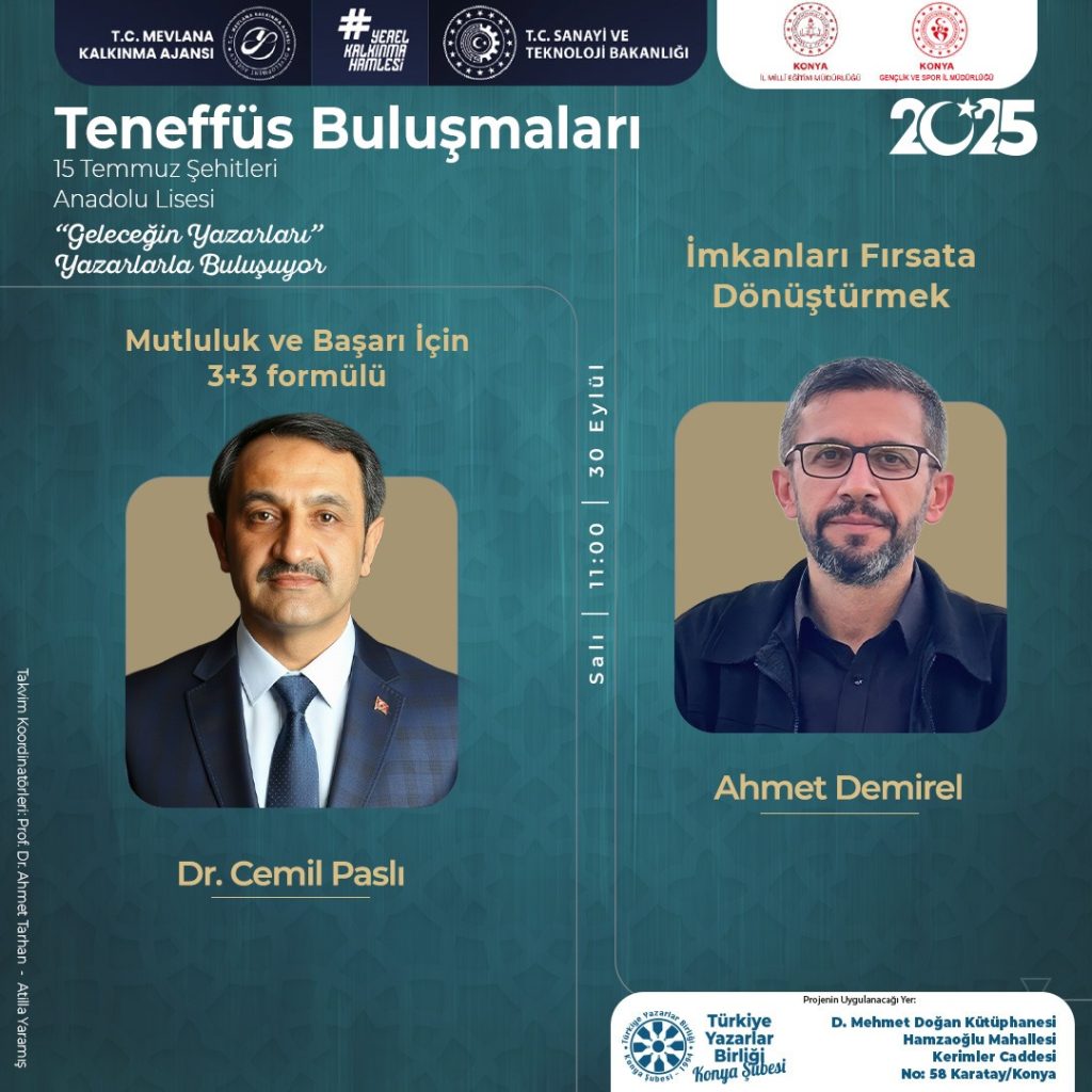 İl Milli Eğitim Müdürlüğü, Konya Gençlik ve Spor İl Müdürlüğü, MEVKA (Mevlana Kalkınma Ajansı) ve Türkiye Yazarlar Birliği Konya Şubesi iş birliği ile yürütülmekte olan “Geleceğin Yazarları Yazarlarla Buluşuyor” projesi kapsamında programlar yapılmaya devam ediyor. Proje kapsamında Ahmet Demirel ile Karatay 15 Temmuz Şehitleri Anadolu Lisesi öğrencilerimizle bir araya geldik.